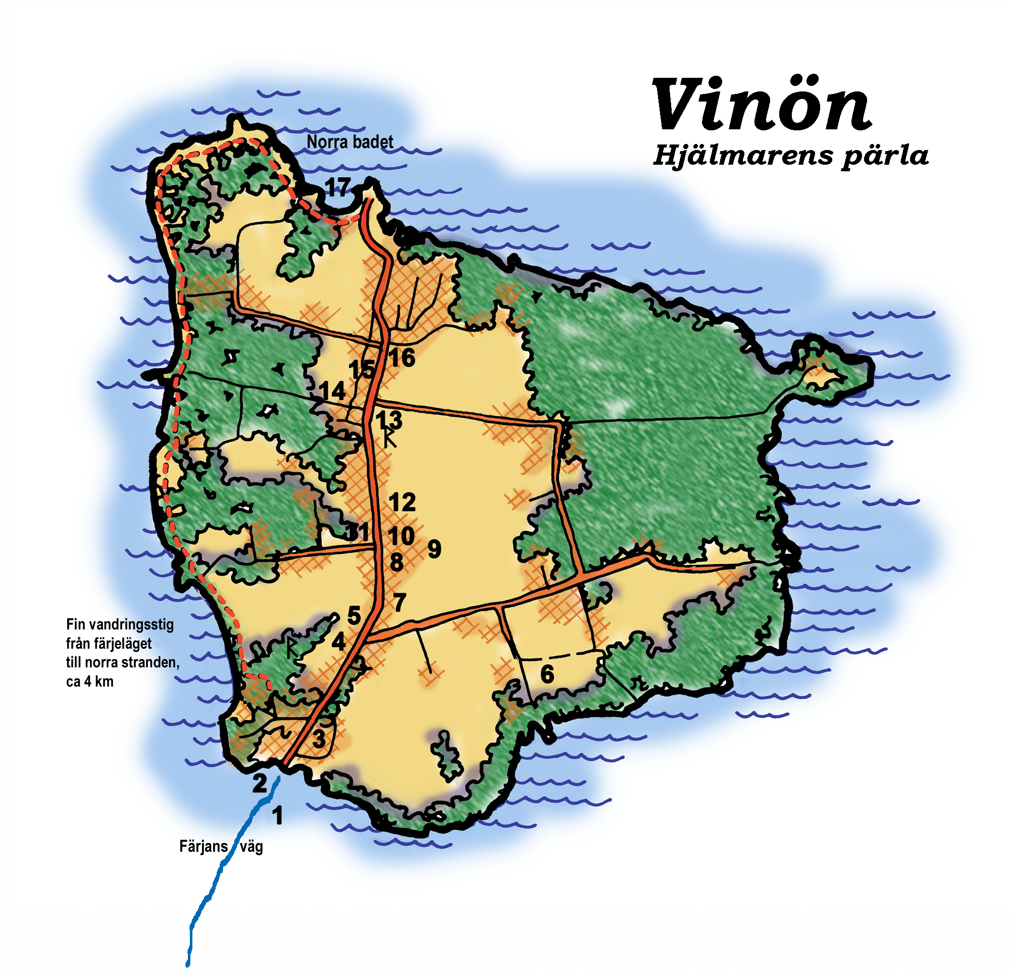 17 – Vinöns Norra badplats. Här finns en fin badstrand, grillplatser, toaletter och soptunnor. Här finns också parkering för bilburna badgäster samt några platser för campare, husbilar och båtar. Kiosken på stranden är till salu! Maila nygardsprodukter@gmail.com vid intresse.